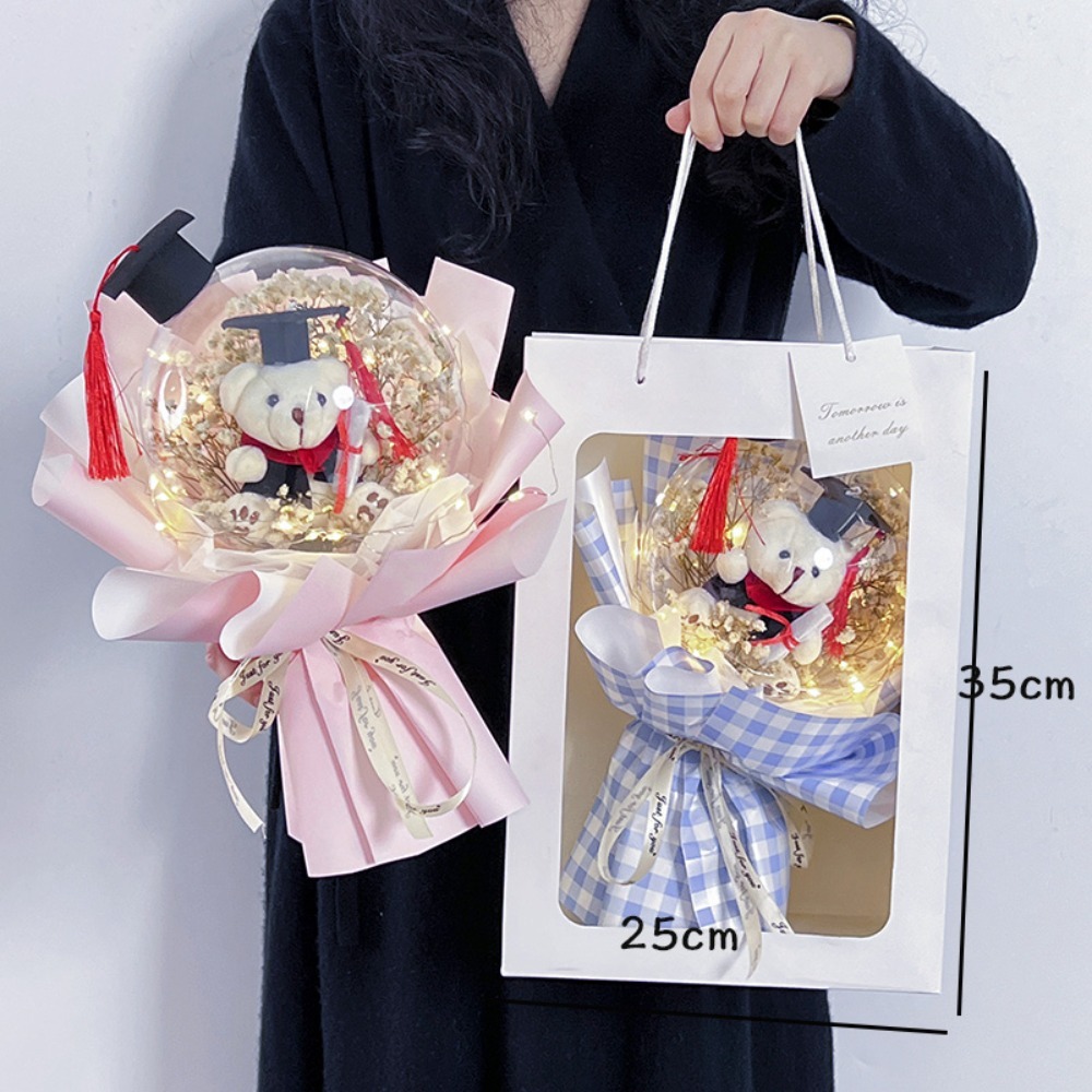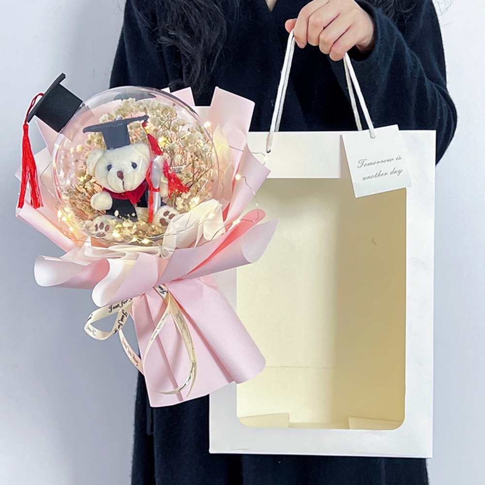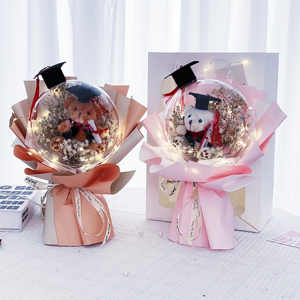 🌟 Fun & Whimsical Design: The combination of the bear doll with the doctor hat, flowers, gift bag, and light string creates a unique and whimsical design that stands out.