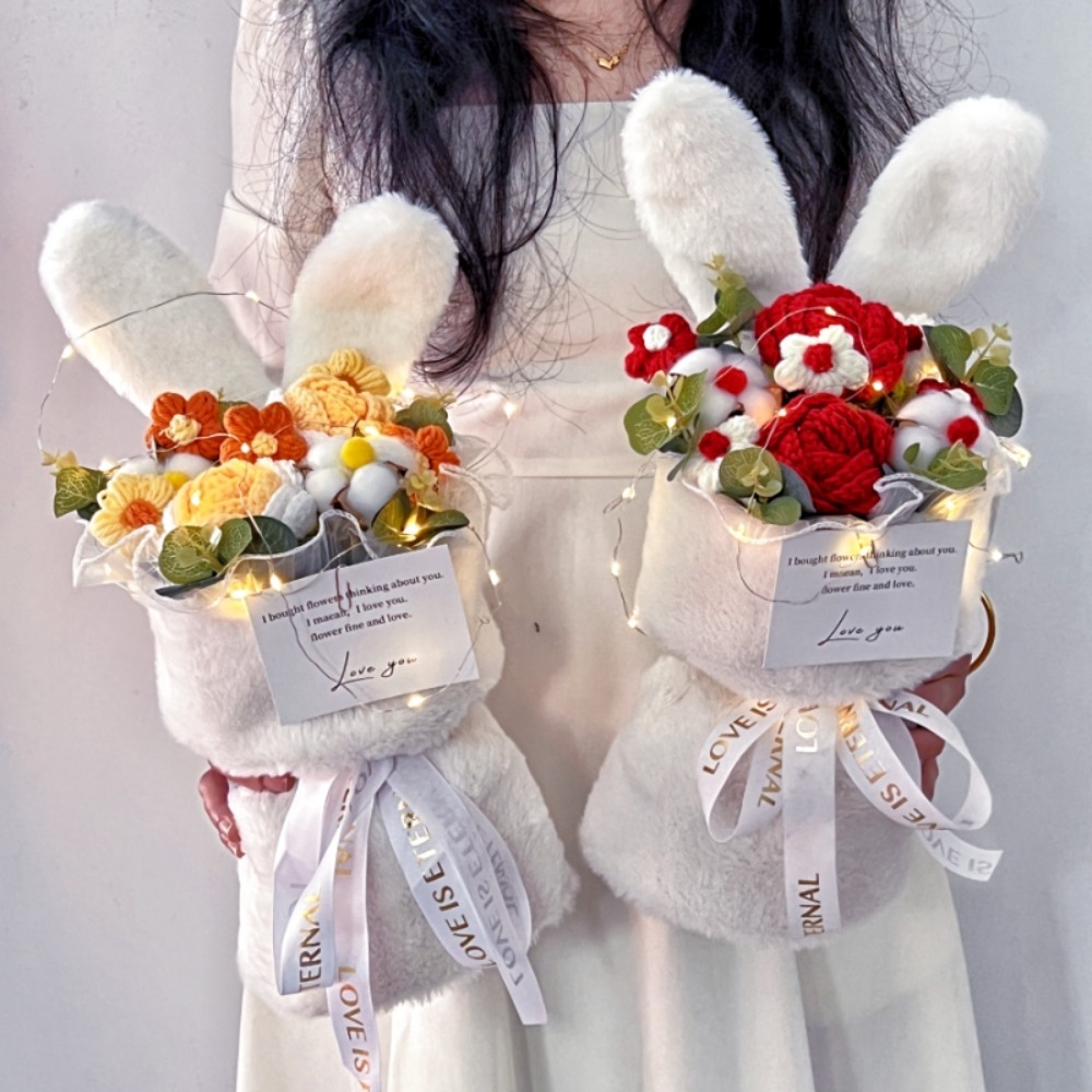 Cute Hand-Woven Rose Rabbit Ears Bouquet with Gift Bag, Light String & Greeting Card, Perfect Birthday Gift for Girls, Ideal for Special Occasions and Romantic Celebrations