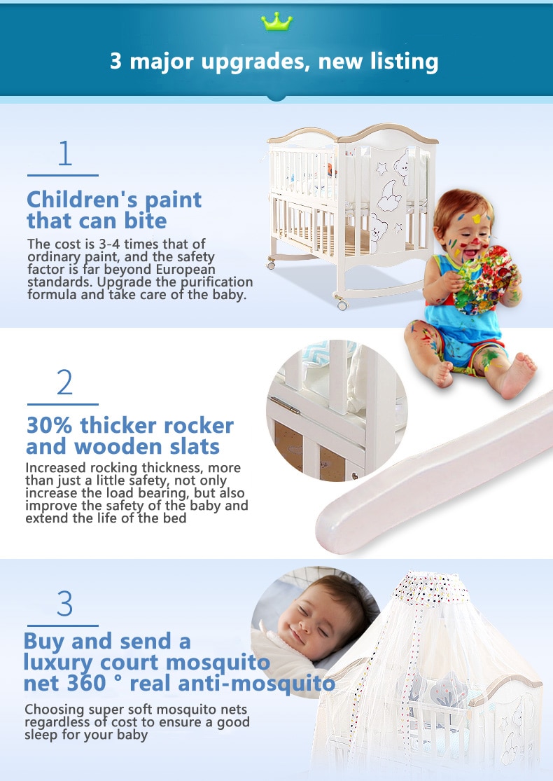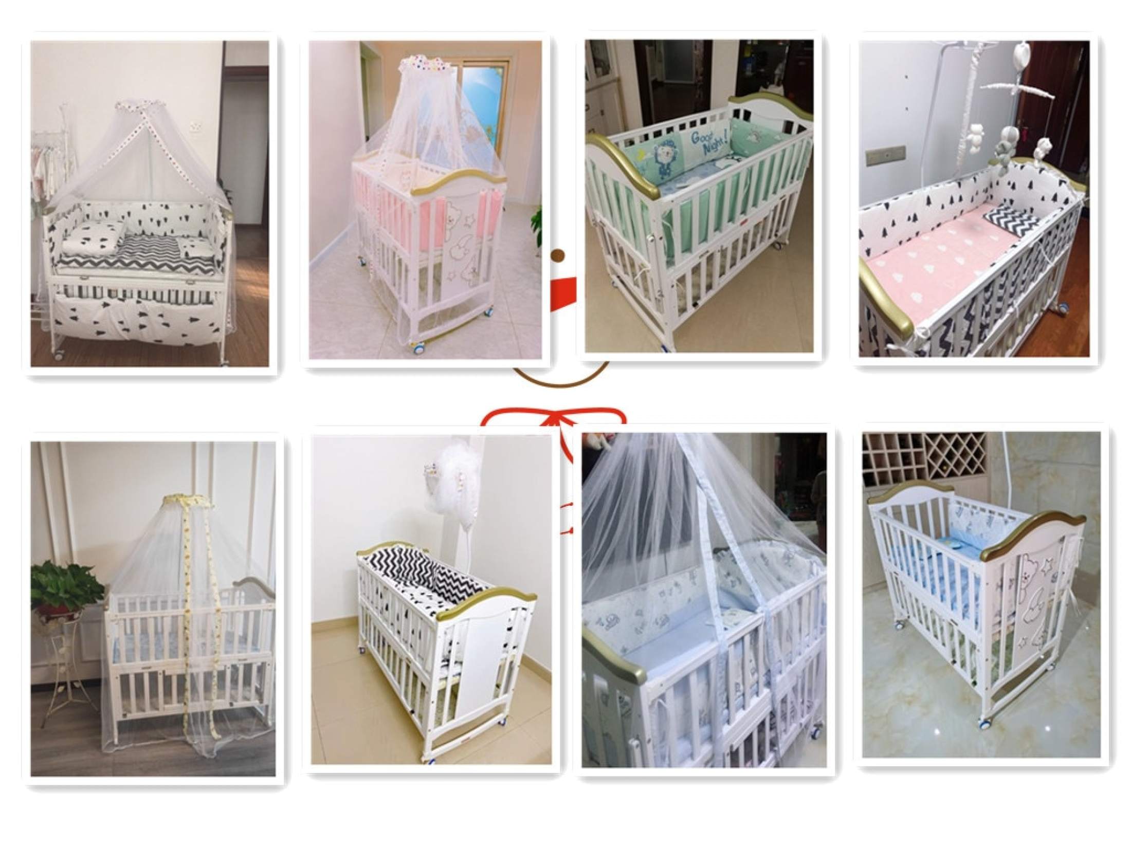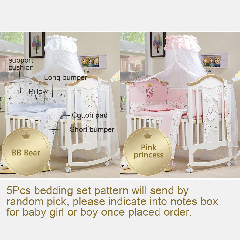 - : Baby Crib: Nature Pine Wood5pcs Bedding Set: CottonMattress: Nature coconut palm mixed foam (Thickness 5cm)Mosquito net: Polyester mesh
